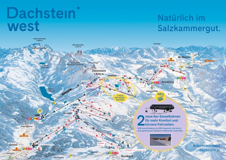 Mitten im Salzkammergut und vor der imposanten Kulisse des Dachstein-Massivs liegt die Familienskiregion Dachstein West – ein echtes Paradies für Genießer, Familien und sportliche Skifahrer. Mit der 44 km lange Skigenussrunde und modernen Liftanlagen verbindet sie die Orte Gosau, Russbach und Annaberg zu einem abwechslungsreichen Skigebiet, das mit seiner Mischung aus Genuss, Panorama und Pistenhighlights für die ganze Familie begeistert. Ob erste Schwünge im Kinderland, abwechslungsreiche Abfahrten oder eine Skitour auf der Atomic Backland Route – in Dachstein West findet jeder sein Winterglück. Im Kartenverbund gibt’s dazu mit 160 Pistenkilometern noch mehr Skivergnügen. Gemütliche Hütten und Sonnenterrassen laden zum Einkehrschwung ein, während das atemberaubende Bergpanorama jede Abfahrt zum Erlebnis macht. Ein Skitag hier bedeutet: Vielfalt, Herzlichkeit und unvergessliche Momente im Schnee.