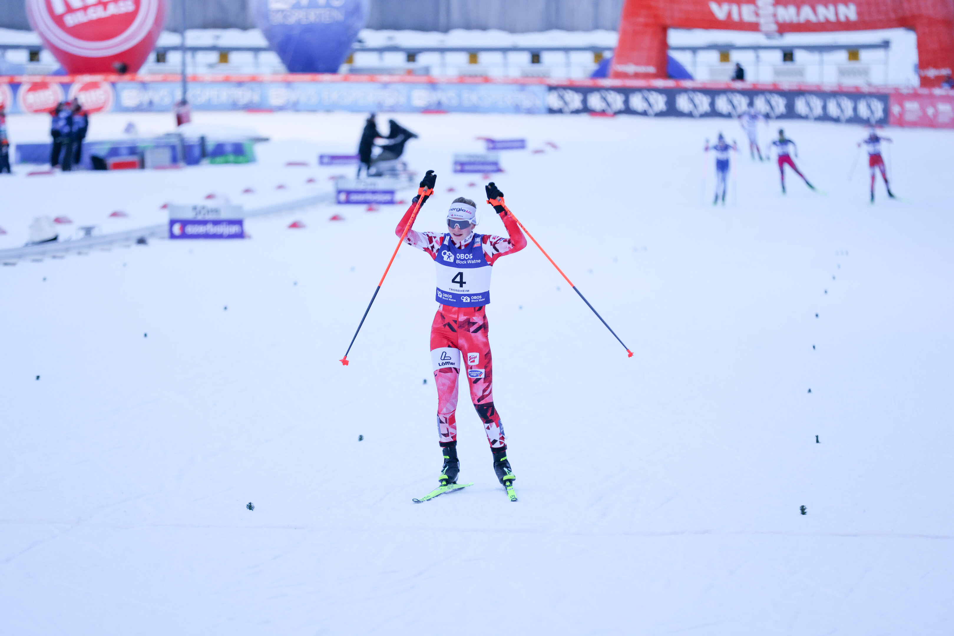 Katharina Gruber: „Ich bin überglücklich und super zufrieden. Mein Ziel war eigentlich, in die Top Ten zu laufen. Jetzt bin ich im ersten Wettkampf gleich knapp am Podest vorbeigeschrammt, das ist Wahnsinn. Ich habe in der Vorbereitung sehr viel ins Springen investiert, auf der Schanze fühle ich mich richtig wohl. Meine Leistung ist immer besser geworden und dass ich es jetzt auch so im Wettkampf rüberbringe ist schon sehr toll. Im Rennen habe ich versucht, bis zum Schluss mit den schnellen Läuferinnen mitzugehen. Es ist mir nicht ganz gelungen, trotzdem bin ich mehr als happy.“
