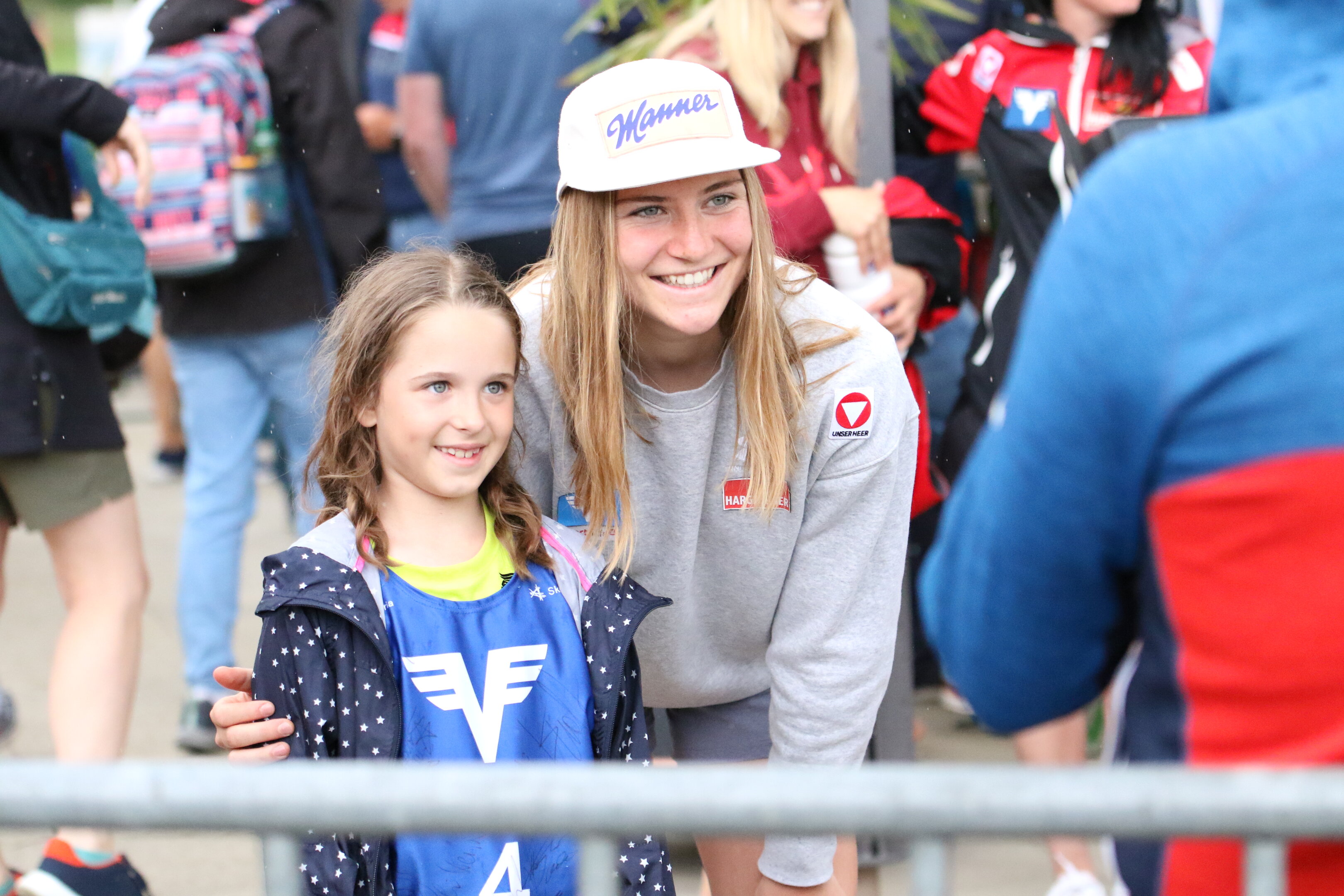 Eva Pinkelnig: „Es ist echt so cool, dass so viele Mädels da sind. Wir unterstützen die Trainer, wir helfen der nächsten Generation. Wir haben geturnt und verschiedene Geschicklichkeitsspiele gemacht. Natürlich haben wir dann auch auf der Schanze viel Spaß gehabt. Der Enthusiasmus und die Freude, mit der sie dabei sind, das ist etwas sehr Schönes. Sie freuen sich auf jeden Sprung und über jeden Sprung, da kann man definitiv, bei aller Professionalität, sehr viel von ihnen lernen.“