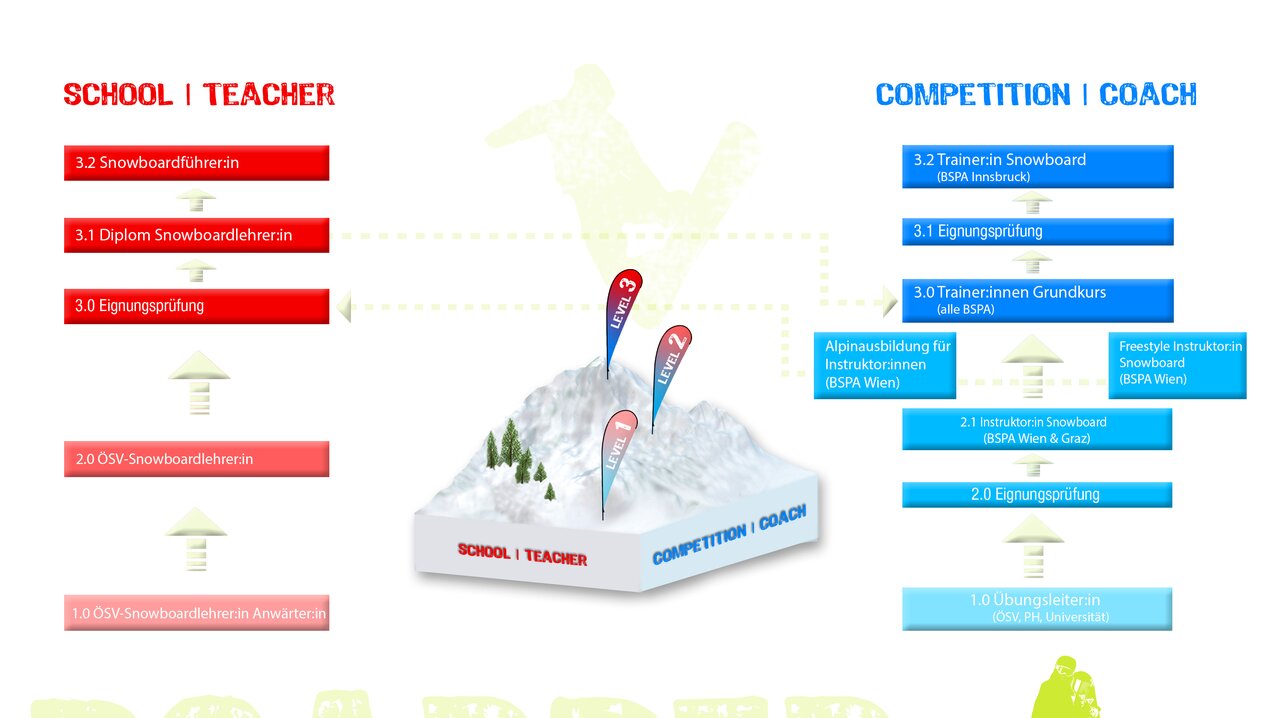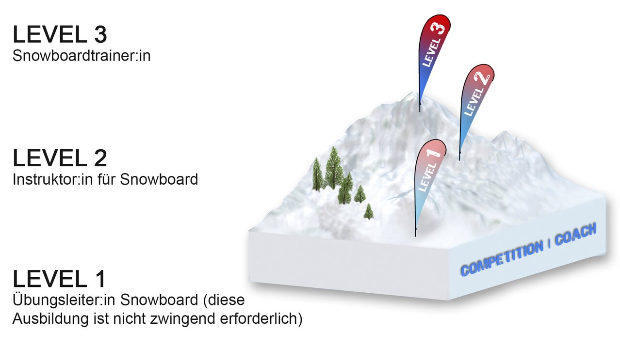 STUFE 1 Die Ausbildung zur Übungsleiter:in wird von den Snowboardreferaten der ÖSV – Landesverbände betreut. Du erwirbst Fähigkeiten und Wissen, damit du als Begleitcoach im Verein unterstützen kannst oder absolvierst mit dieser Ausbildung den Grundkurs für die Ausbildung zur Instruktor:in an der Sportakademie Wien.