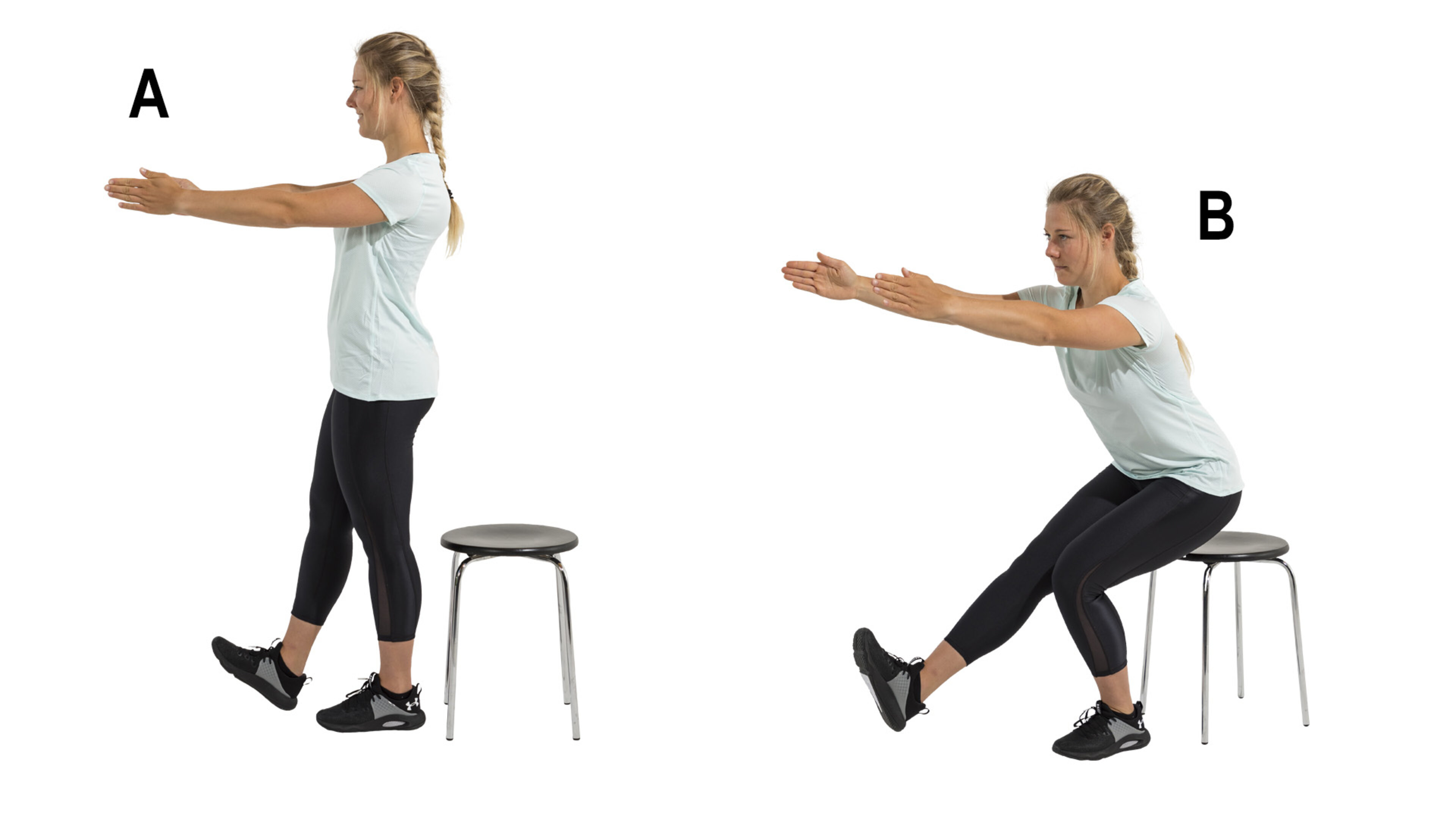A. Stellen Sie sich aufrecht und hüftbreit vor eine Erhöhung (Box, Stuhl, Stufe etc.), die bis knapp unter Ihr Gesäß reicht, und strecken Sie Ihre Arme gerade nach vorne.