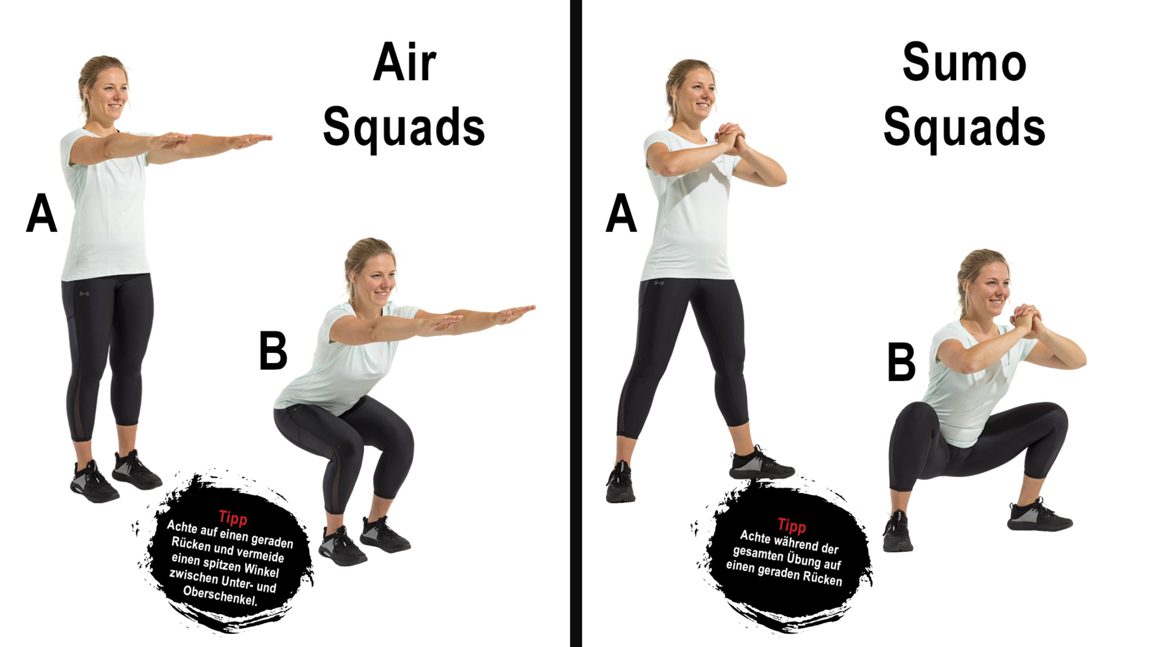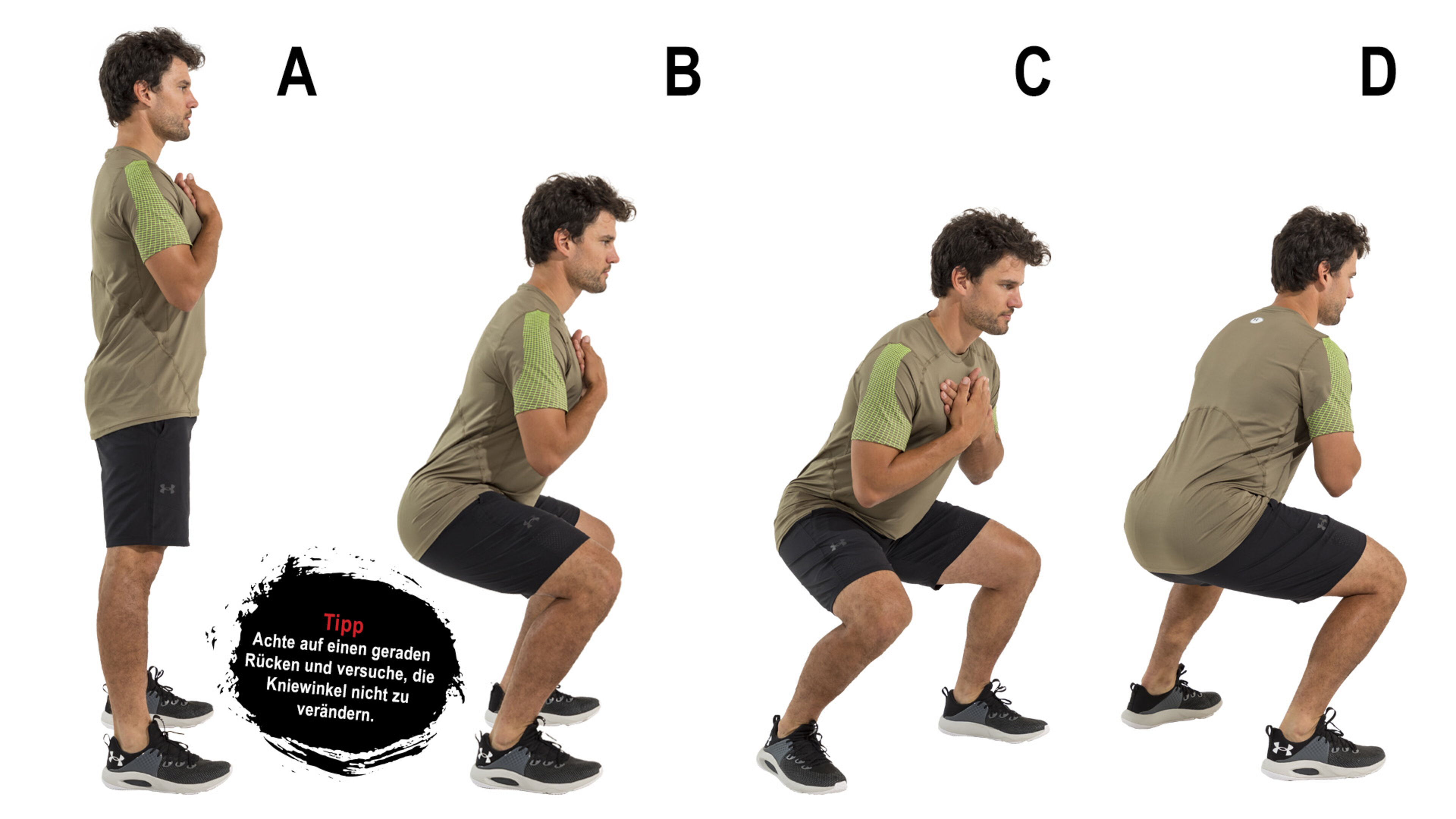 B. Nun beugen Sie Ihre Knie so weit nach unten, bis Ihre Unterschenkel in einem rechten Winkel zu Ihren Oberschenkeln stehen. Anschließend drücken Sie sich wieder in die Ausgangsposition.