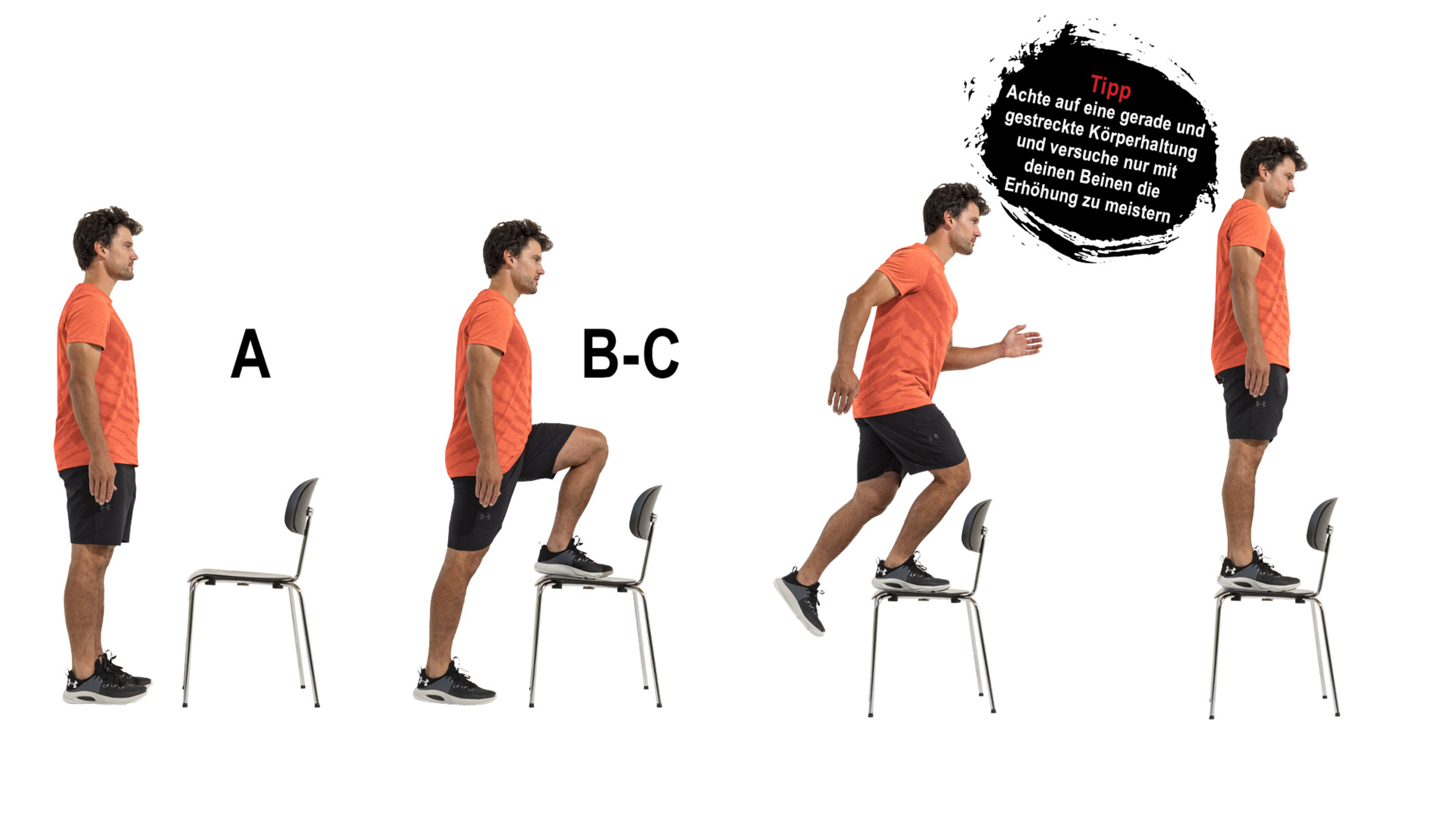 A. Stellen Sie sich hüftbreit und aufrecht vor einen Stuhl, eine Stufe oder eine anderweitige Erhöhung.
