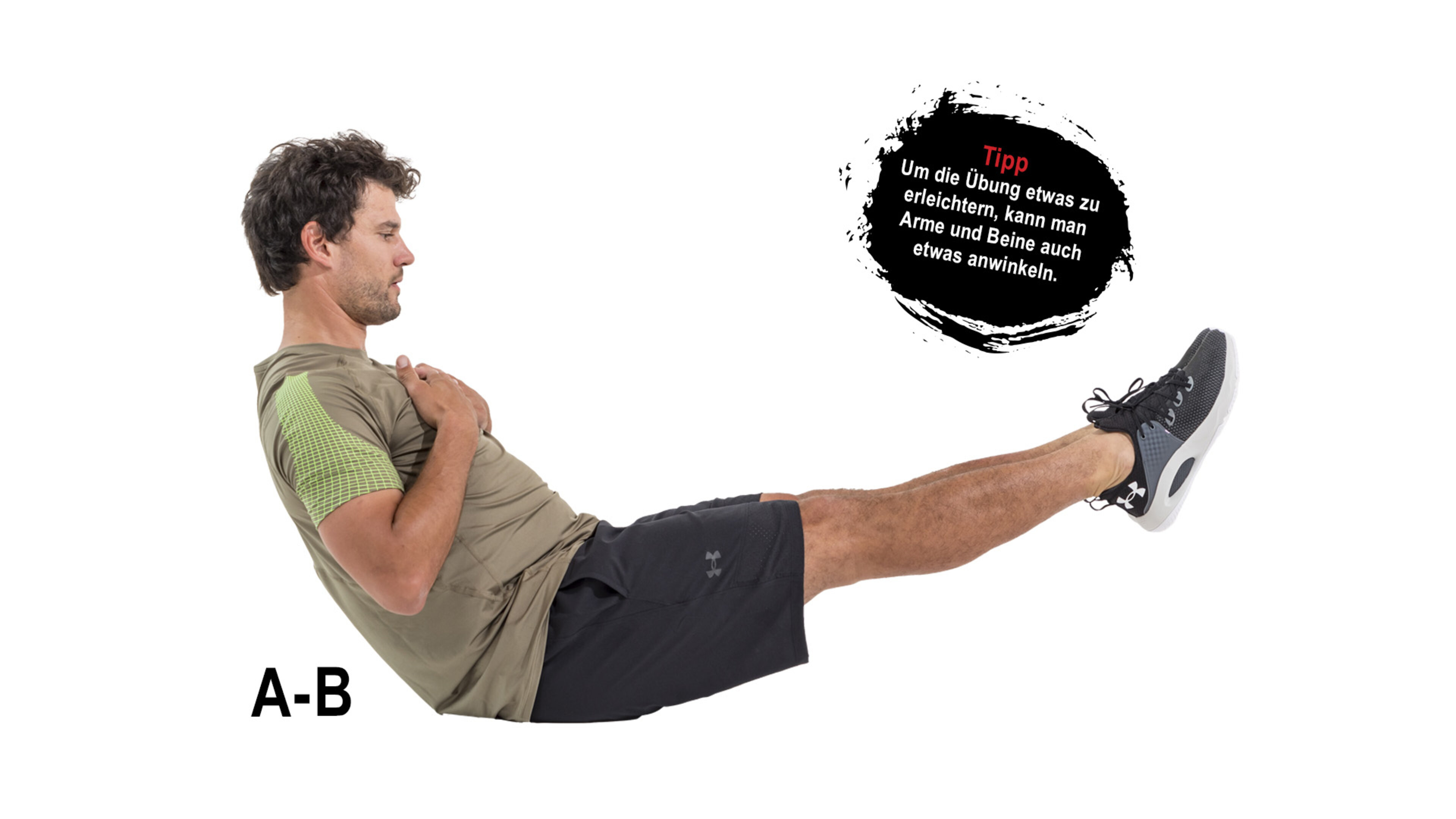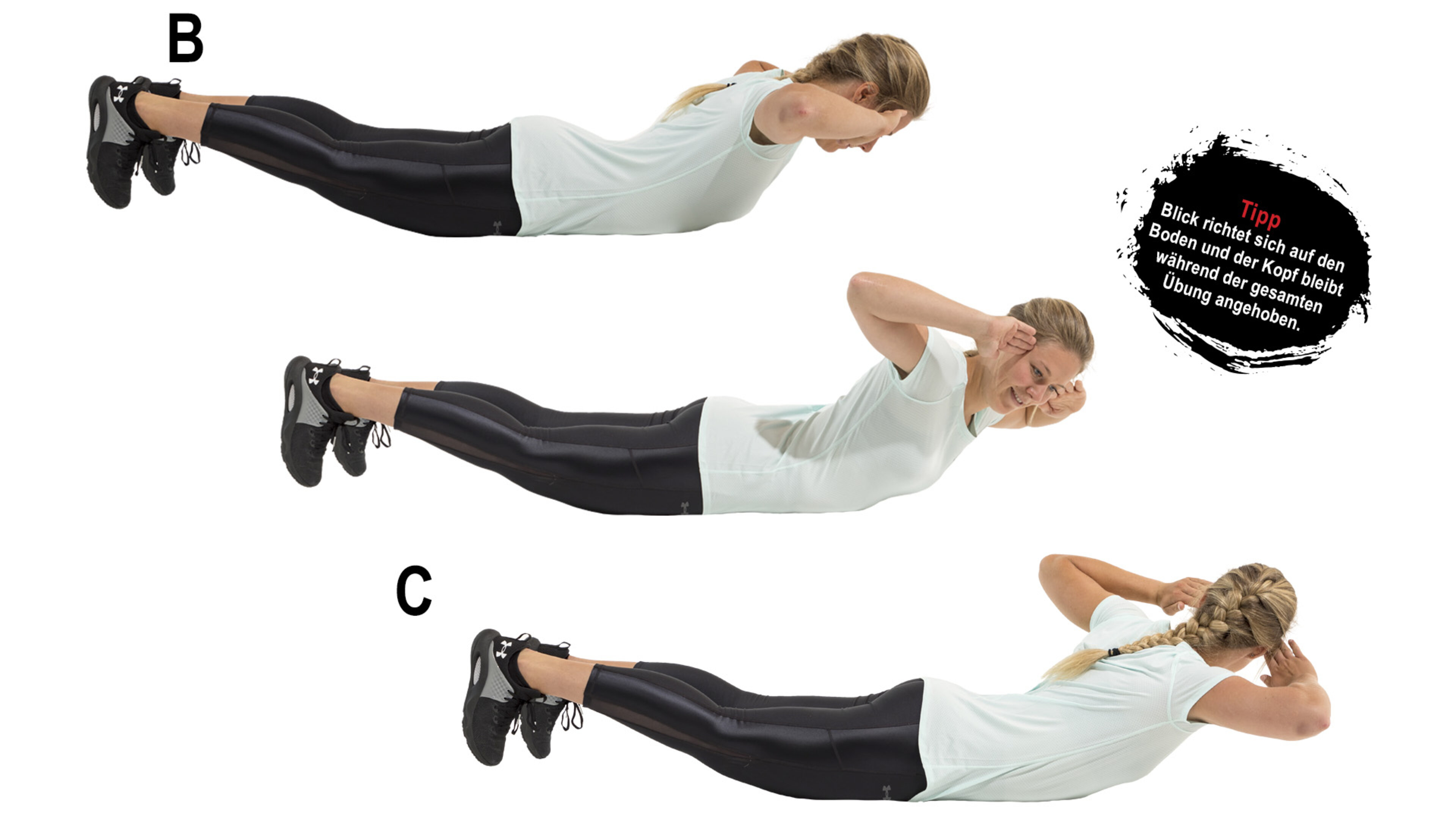 B. Versuchen Sie mithilfe Ihrer Bauchmuskulatur Ihren Oberkörper und Ihre Beine ca. 20–30 cm vom Boden anzuheben und halten Sie diese Position.