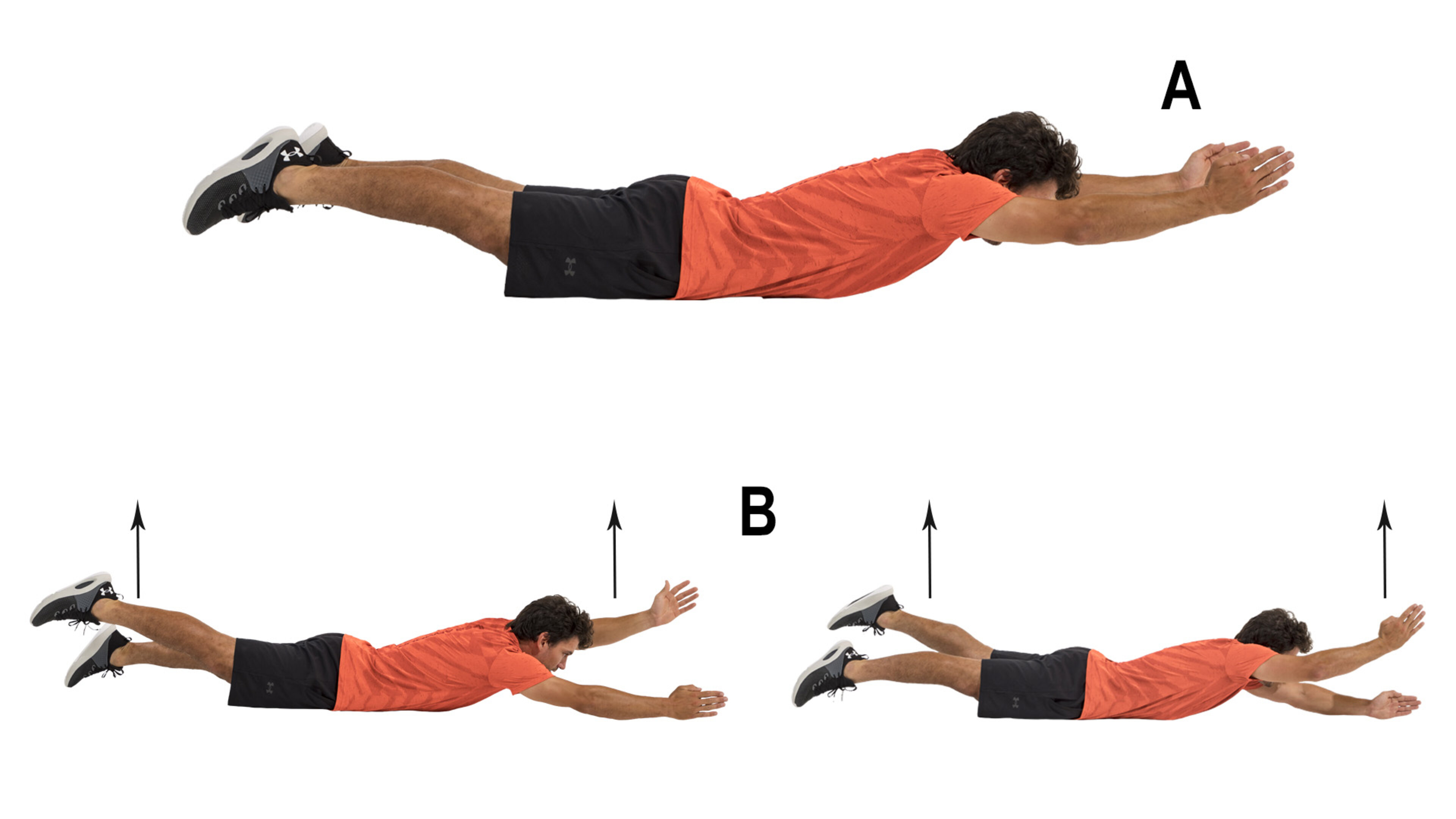 B. Heben Sie nun beide Arme und beide Beine vom Boden an und führen Sie kleine, aneinandergereihte Auf- und Abwärtsbewegungen aus.