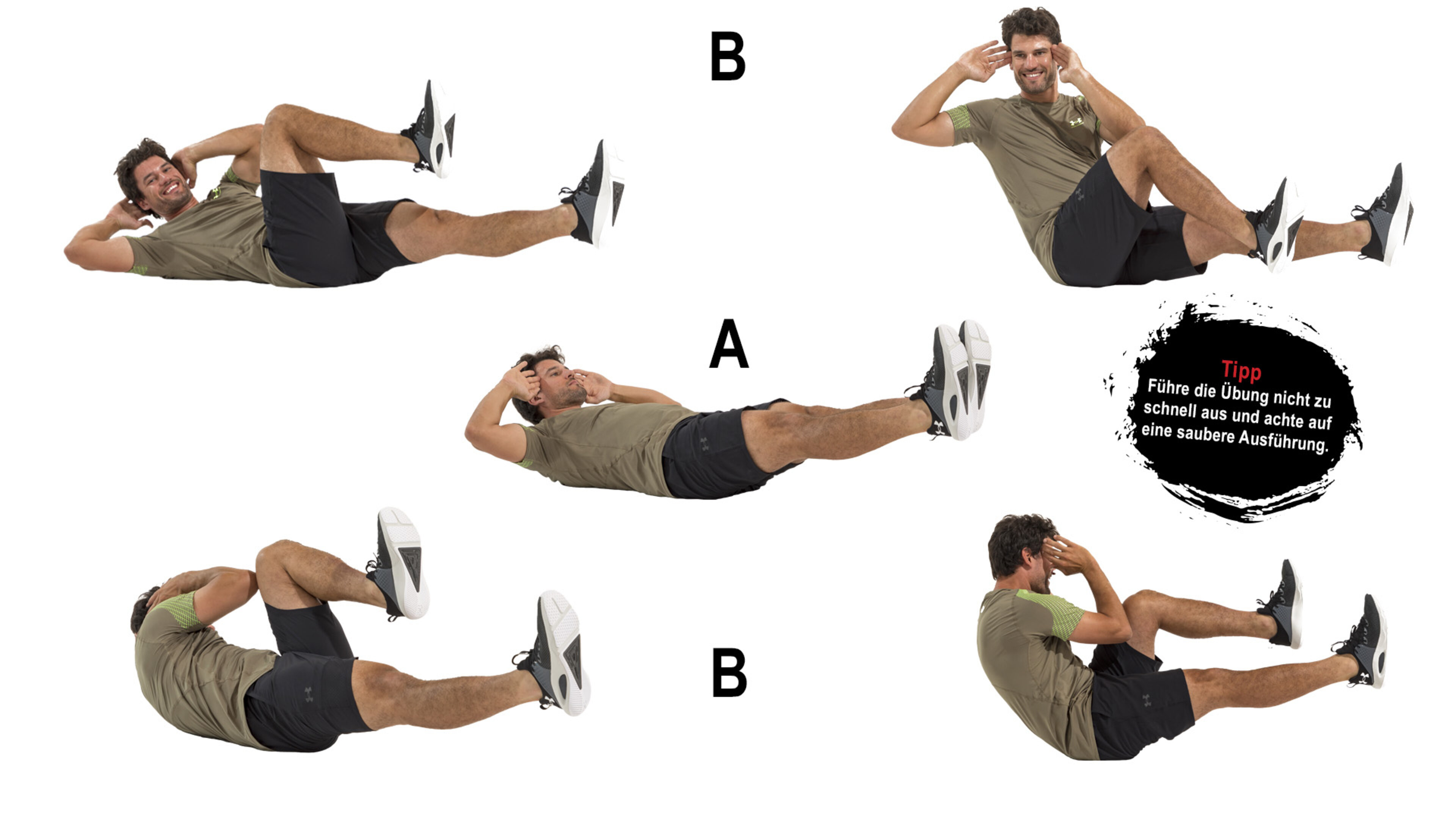 A. Setzen Sie sich auf den Boden, lehnen Sie Ihren Oberkörper nach hinten und heben Sie Ihre Beine vom Boden an.