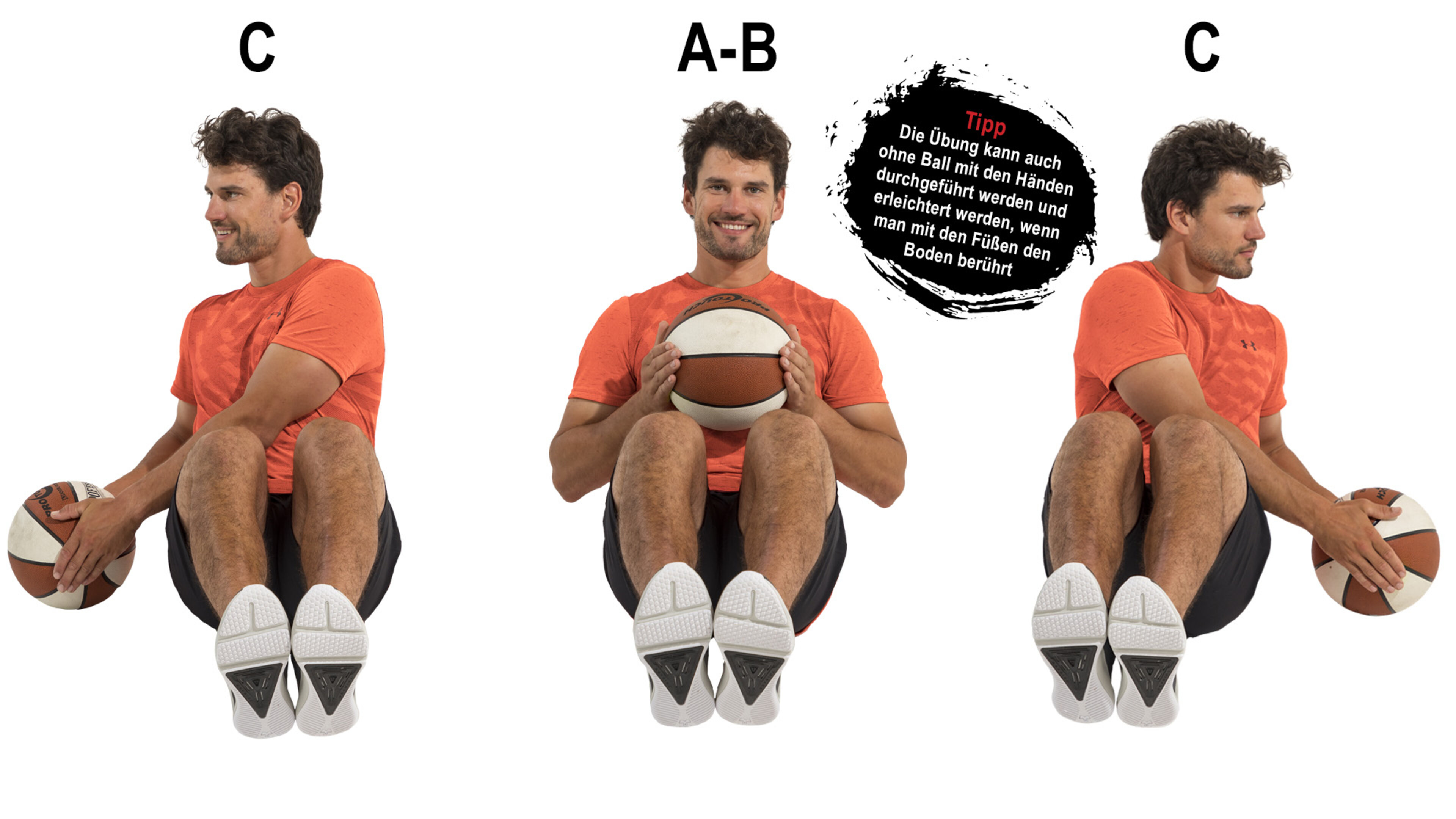 A. Setzen Sie sich auf den Boden und winkeln Sie Ihre Beine an. Halten Sie einen Ball frontal vor Ihrem Körper.