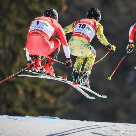 Kopf-an-Kopf über Kicker, Roller, Steilkurven und Sprünge: Skicross zählt ohne Zweifel zu den actionreichsten und spektakulärsten Wintersportarten.